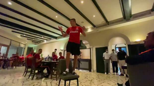 Форвард московского «Спартака» Александр Соболев отметил годовщину нахождения в команде. На командном ужине футболист, стоя на стуле, исполнил песню «Знаешь ли ты», которую поет поп-певица Максим.