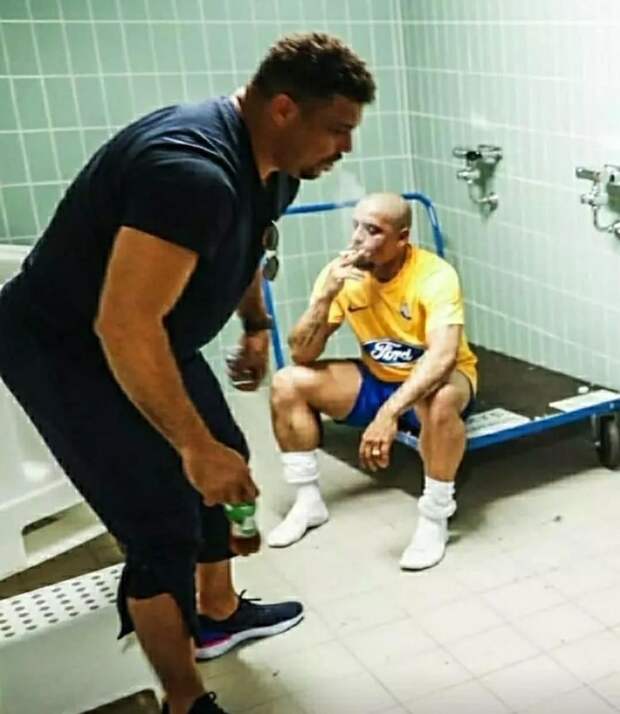 Ronaldo with Roberto Carlos smoking a cigarette at half-time of a charity match.